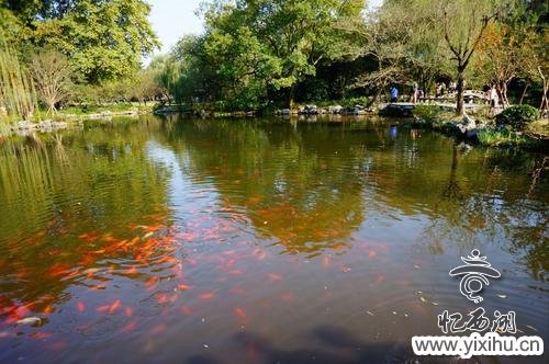 红鱼池位于园中部偏南处,是全园游赏的中心区域。池岸曲折自然,池中堆土成岛,池上架设曲桥,倚桥栏俯看,数千尾金鳞红鱼结队往来,泼刺戏水。